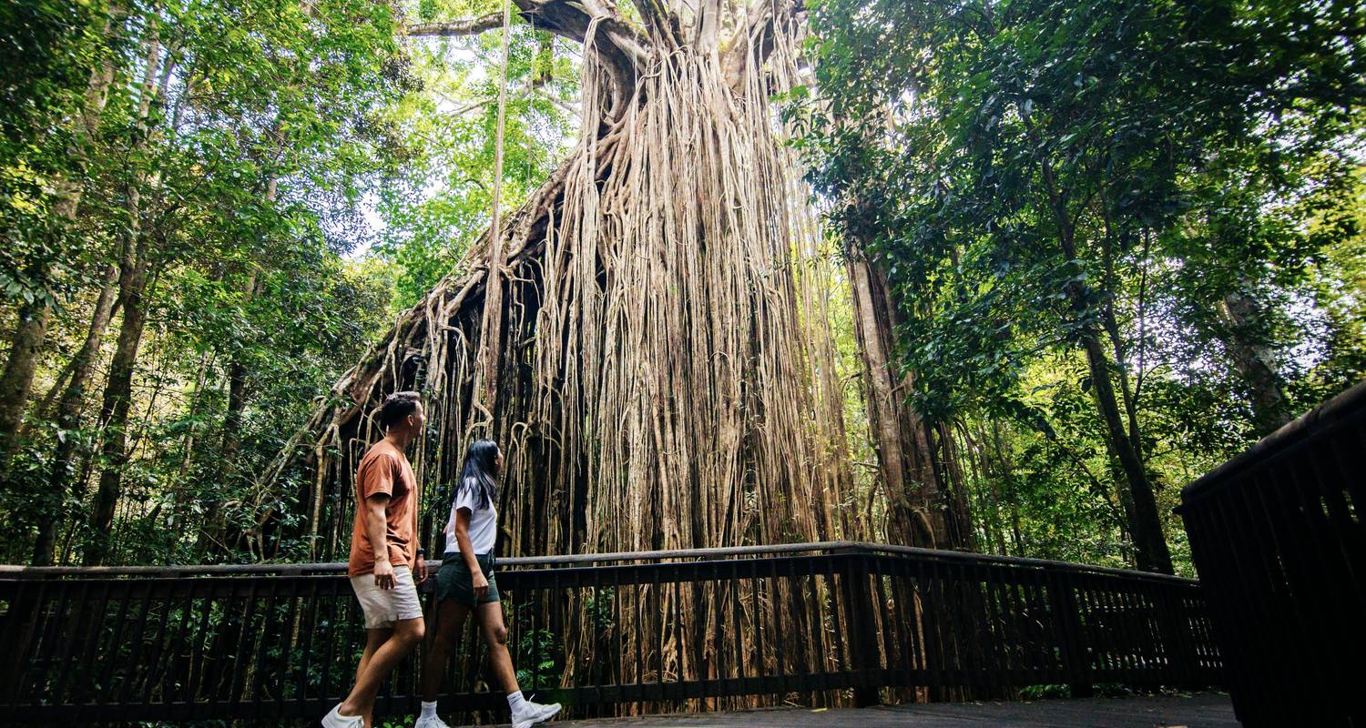Enjoy breakfast before we travel into the wet tropics of Far North Queensland. We'll discover a magnificent plunge waterfall nestled in dense tropical rainforest en-route to the Atherton Tablelands. Take a dip in the cool water before we head to Lake Eacham, a crater lake with crystal-clear water, and visit the massive ‘Curtain Fig Tree’. We'll finish the day in Cairns, one of Australia's most vibrant, tropical and energetic cities.