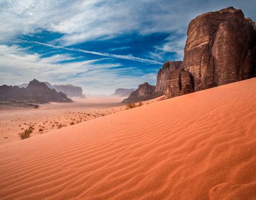 After having breakfast in camp, our adventure begins with a jeep safari through the dramatic landscapes of Wadi Rum, navigating its sandy trails and wandering beneath towering 'jebels'. Along the way, we pause to climb the sand dunes and marvel at the unique rock formations, including a breathtaking natural rock bridge.